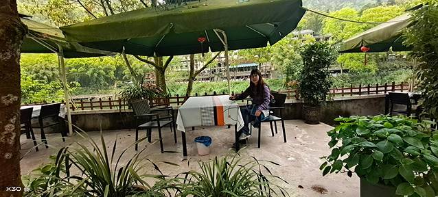 大约4点多,到停车处的那个餐馆吃饭,被老板忽悠的全点了他们价格高的鱼和钵钵鸡,着实吃不完。正吃着,又有一大妈搭话,推荐晚上去峨眉山一个叫水云间的酒店住宿,还当下联系了说有个湖景房才300元。我们考虑当晚住到峨眉山下也好,方便第二天早早上山。于是按照大妈给的联系方式和地址,吃完晚饭后就开车往距此50公里的峨眉山。1小时后到达峨眉山脚下,酒店在峨眉山上清音阁,不好找,酒店那边人来接我们。到达后才发现这最多就是个小民宿,什么湖景房呀,完全不是这个概念,但确实是有个湖。这里民宿聚集,满眼的绿植生机勃勃,让我着实喜欢。