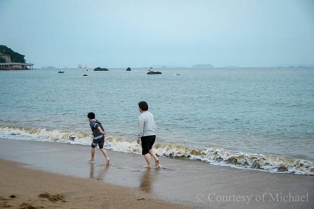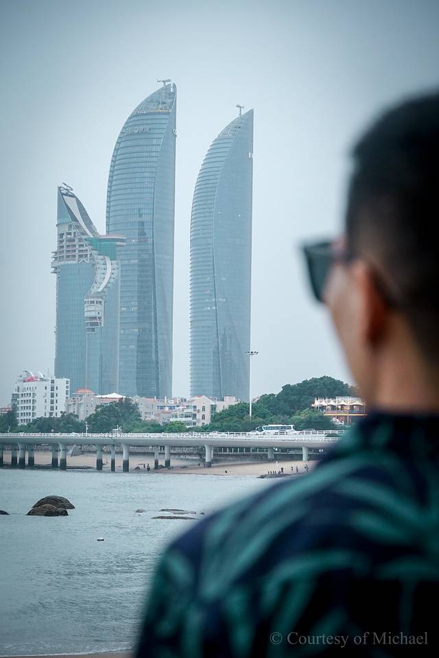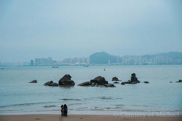 当潮褪去,还能看到不远处礁石下连着巨大的礁盘,已成为明信片上最标志性的一景。在这里也能看到厦门新的标志性建筑,双子塔,与沙滩大海,城市建筑相互融合,既文艺也有现代感。
