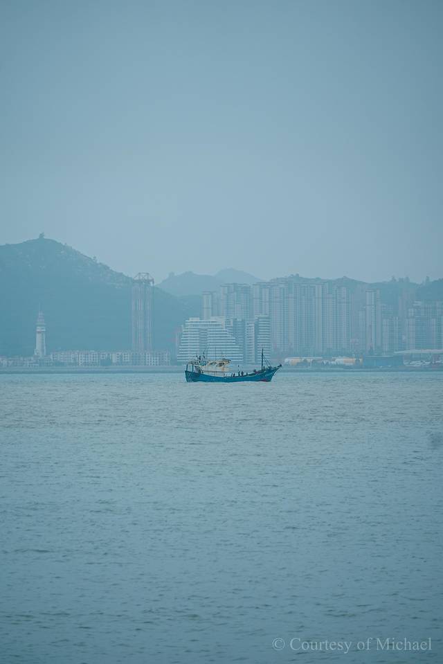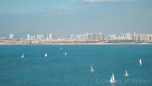 蜿蜒的海岸线,绵长的海滩,壮阔的海面,细软的沙滩划出漂亮的弧线。这已是一处不可多得的柔软细腻的沙滩。海水拍打着沙滩,留下许多贝壳,而远处的船只构成了一幅幅美丽动人的明信片风景。