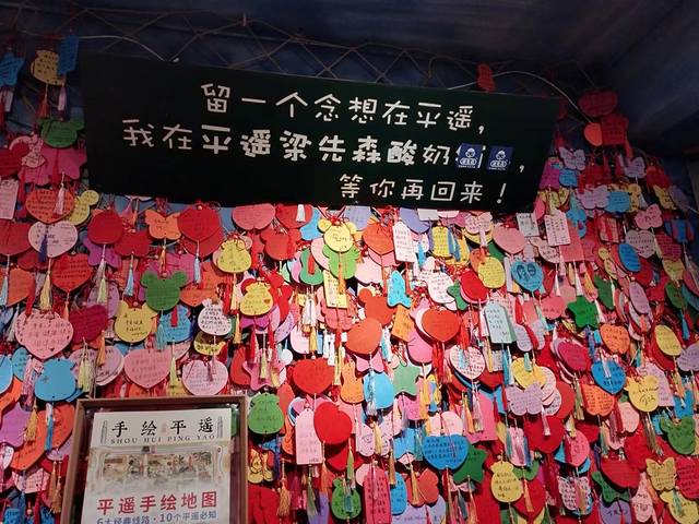 这次来我们最后打卡了网上很多人都推荐的梁先森·酸奶,刚看到店铺的时候,就感觉它很文艺,老板服务也很热情,在我们购买了老陈醋炒酸奶之后就问觉得酸可以加酸奶,觉得醋味不够的话添加醋,推荐老酸奶、老陈醋酸奶、沙棘酸奶,记得一定要搅拌均匀哦,里面还有原创冰箱贴,瓦当冰箱贴,还可以打卡了“总要和喜欢的人去一趟 平遥 ”的路牌,填写了许愿牌。