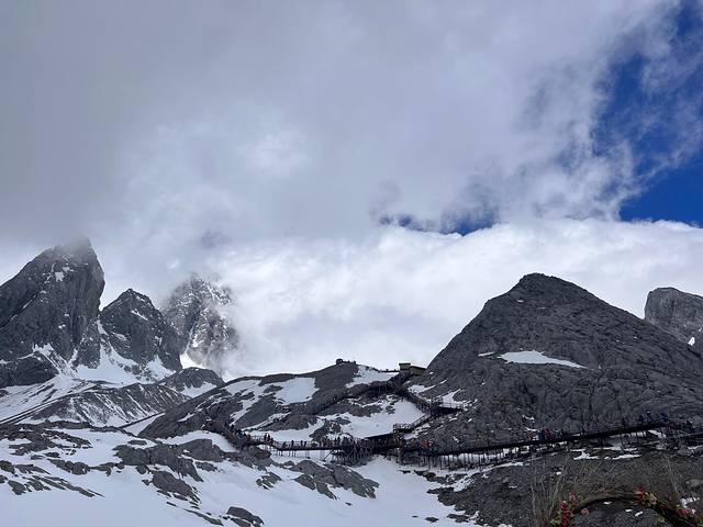 如果说蓝月谷是甜点,那么雪山就是难啃的骨头。二十多度的阳光明媚的中午,我和老婆以为不需要带上笨重的羽绒服,等上了索道,就真的庆幸还是带上了呀。下了索道后就到了海拔4450米,眼睛看到提被积雪盖着的黑山峰, 剩下要爬200米只能任由游客各凭体力, 大部分人抱着来都来了的心态,抱着氧气瓶,三步一吸往上攀爬。山顶的风光也见得有多美,而云层倏忽即来,倏忽即去,常有雾气和雪花影响视野,但是登上了最高点的那种征服感,小小的满足感, 算是一点补偿。