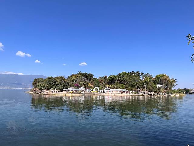 离岸不过五十米,有一个圆形小岛 -- 南诏风情岛, 岛上植被非常茂盛,是岸上游人拍照的绝佳背景。岛上有参天大树,比人还胖的紫竹,以及本主文化馆。 所谓本主文化,是白族人的精神图腾, 他们不是崇拜远古真龙或是山林猛虎, 而是推崇自己的英雄,只要是生前做出过杰出贡献的人,如战功彪炳的将军或是治学传道的儒家君子贤人,死后就都能位列本主,成位当地人顶礼膜拜的神灵。除此之外, 外族入侵者如成吉思汗,也是白族人信仰的本主。