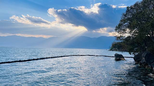 下午游玩累了, 赶在日落之前,回到海景房里躺着,看夕阳透过云层,光辉洒向洱海, 岂不美岂!当夕阳沉到海里,独留彩云飘在蓝天之上,等待迎接月亮驾临。
