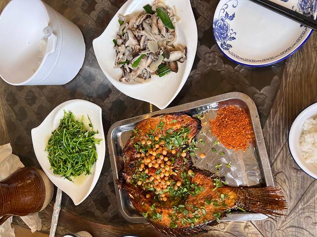 当我们走三,四公里,才从北到南边近出口处, 有一座小桥,桥边放有个水池,活水流入水池冲刷着饭店新买的“水性杨花”菜,炭火烤鱼的香味吸引的游人。 我和老婆一致认为这顿烤鱼是我们这次旅行吃过的最好吃的一顿饭。