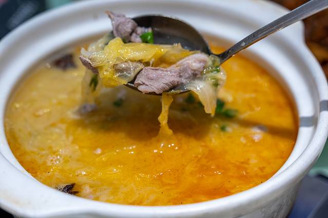 点了鱼头泡饭(必点菜)、小炒肉(必点菜)、土烧打野小公鸡、小炒野山笋、牛肉锅仔、酸菜炖羊肉、红汤羊肉汤、洛馍撒子、荞麦胡等等,对于出生在北方我的来说,这里的饭菜简直就是家乡菜。鱼头经过长时间煨制,鱼肉软烂且汤汁浓郁,将汤汁浇在刚煮好的米饭上,米饭的香甜与鱼汤的浓郁混合在一起,那味道鲜美极了!