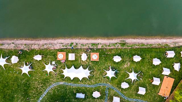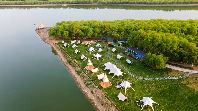 整个营地分为两大部分,引河河畔露天的营地和新汴河畔藏在林子里的营地,帐篷数十顶,规模颇大。从空中俯瞰,双河交汇的营地景色相当壮观,清幽的环境,清澈的河水,真的是理想中的露营地。