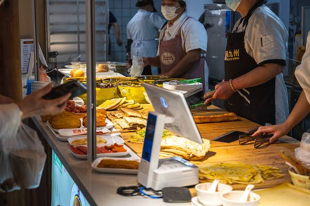 原来闯九州是当地一家著名的餐饮连锁企业,在当地有着较高的品牌知名度,以砀山特色美食为主,比如撒汤、水煎包、狗肉、烧饼、豆粥、锅贴、糁汤等等,品类十分丰富,琳琅满目的早餐让人眼花缭乱。