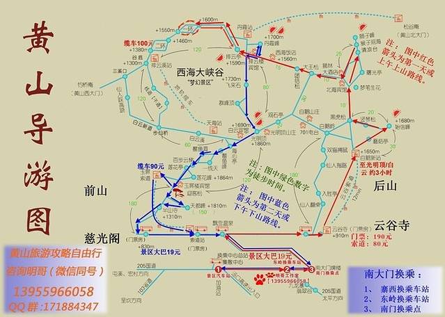 南门可以从云谷索道上玉屏索道下,或者反过来,选择前者的稍多,前山险峻,后山秀丽,其实选择什么路线没什么区别。