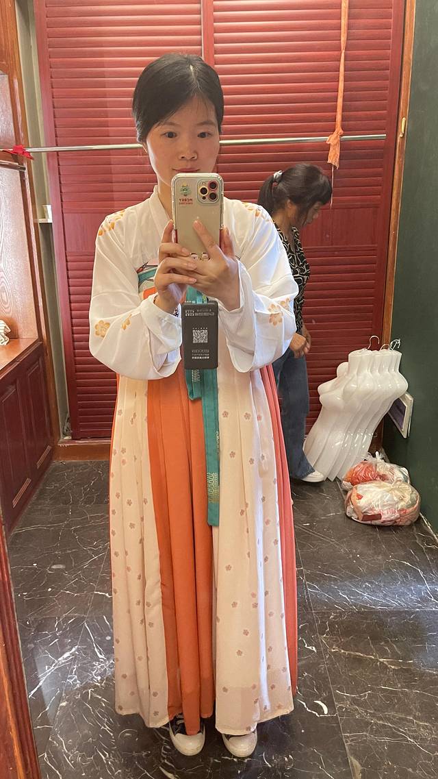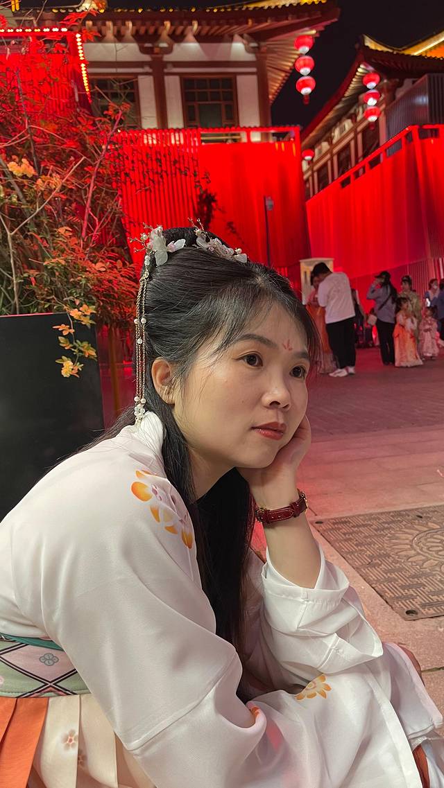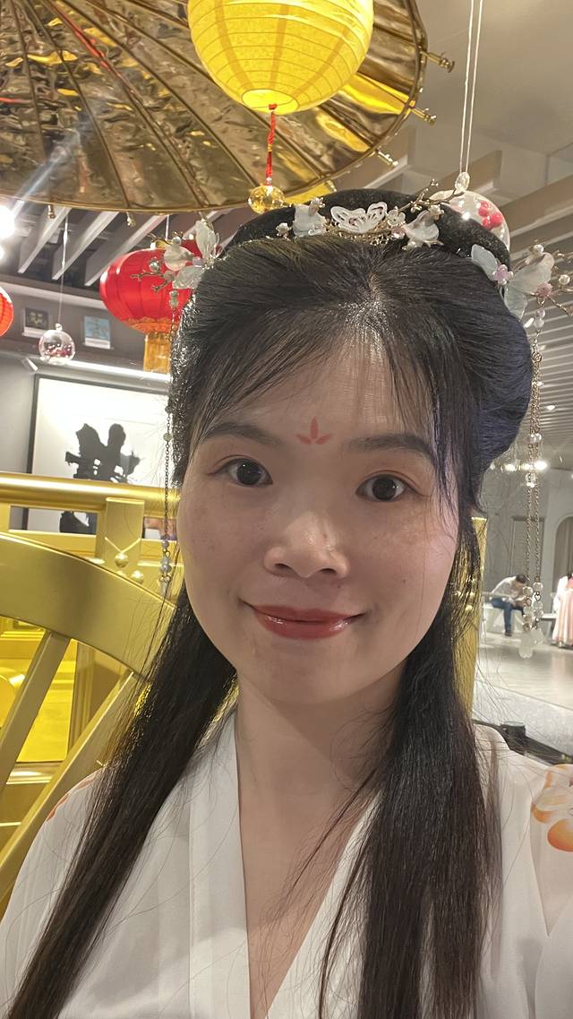 选了一套汉服,可是真不好穿,全靠一个系带绑着整个里面的裙子,所以要绑得特别紧!
