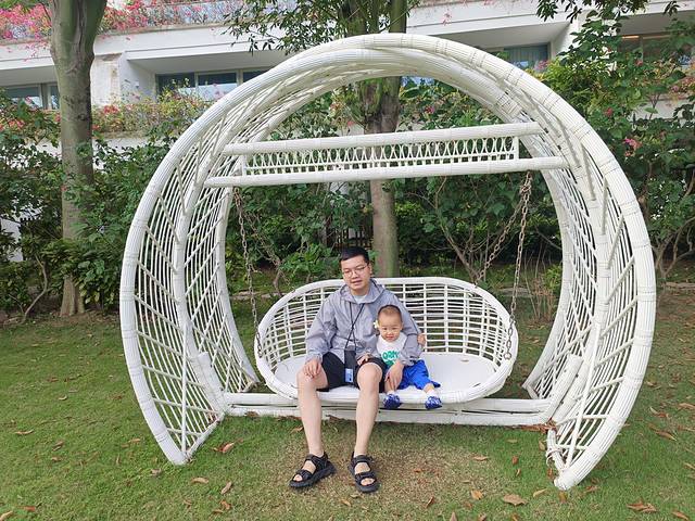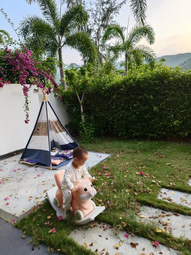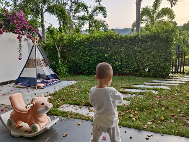 吃完饭,一家三口回酒店睡到了四点多(直接导致了我夜里根本睡不着啊)。酒店整体卫生条件还是挺好的,公共空间基本没看见全貌,因为定的庭院家庭套房在别墅区比较靠里面,很安静,要做摆渡车到大堂,所以酒店整体怎么样没看见。这个房间基本是我住过的酒店里最大的了,页面标注是有80平,小朋友跑来跑去比较能活动的开,还有滑滑梯和摇摇马可以玩。