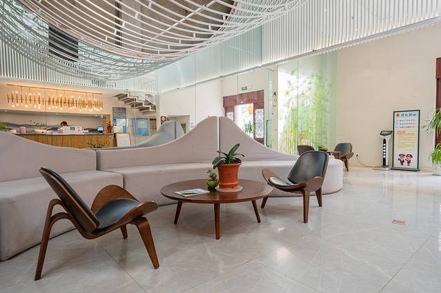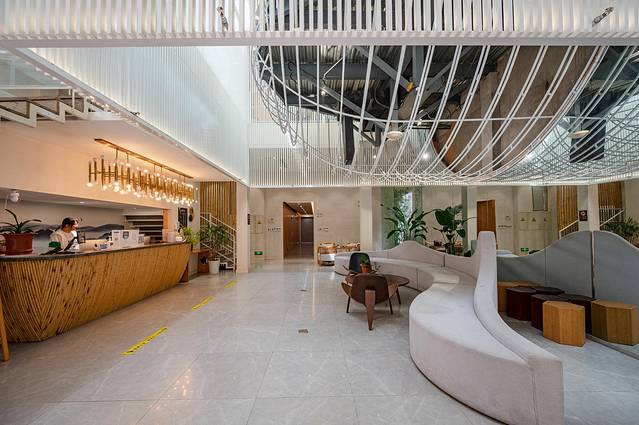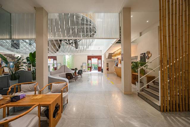 大堂用镜面的设计让整个空间看起来更加开阔,一进门就能感受到放松的度假感。