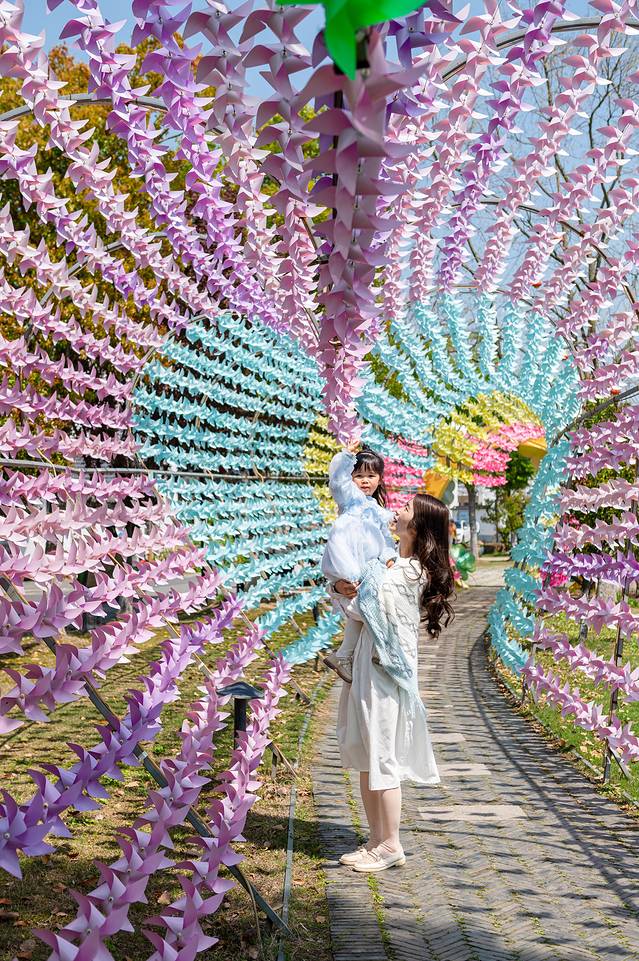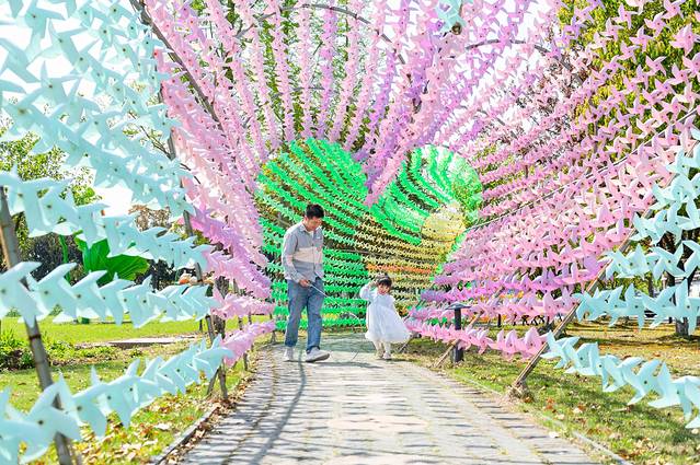广场上有一条很长的风车廊道,微风拂动下,听着风车转动的声音,悦耳动听~