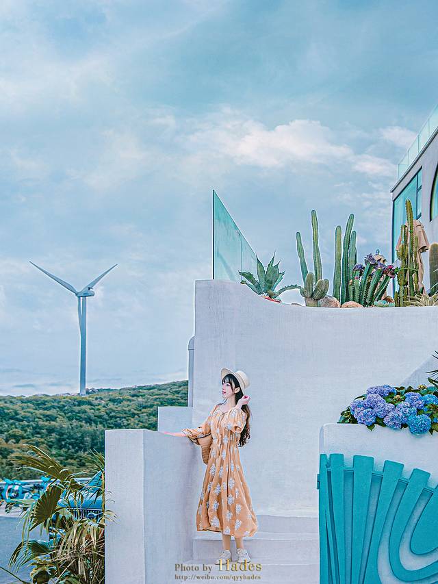 蓝白的建筑,配上这C位视角的风车海,怎么拍怎么美!这里的时光,最适合坐下来听风,看海,邂一场日落,逅一次日出!