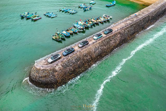 开车走进沿海的村子里,便被村前半月的海湾吸引住了。在村中的高地,停车便可与礁石海浪合影,下到港湾,便能触摸细腻的沙滩。拍完照,合过影,我们也入乡随俗,在渔港前的防风堤,也把车子像渔船一样整齐排好。