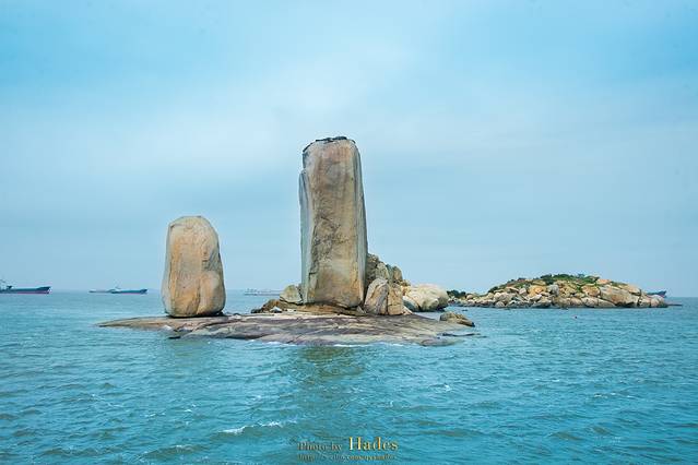 入岛第一站,打卡下平潭十景之一的石碑洋。石碑洋又称半洋石帆,是世界上最大的花岗岩球状风化海蚀柱。海面上,两块白色花岗岩巨石并峙而立,一高一低,高者33米,低者17米,底部尤一整片礁盘托起,形状犹如行舟扬帆。乘上游船,可以近距离360度环绕观赏巨石巍峨。