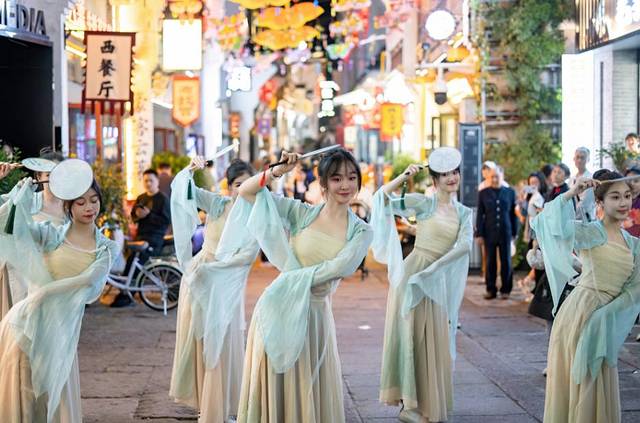 暮色降临,霓裳舞、民乐曲,一曲动惊鸿,精彩表演在古城街上轮番上演,曼妙的舞姿给观众带来一场精妙绝伦的视觉盛宴。
