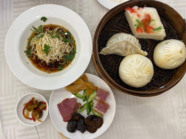 早上吃的怡园,到哪叫号我们前面排了151号,我的天啊~!后来前面接待说要是吃套餐不用排队,上三楼直接吃,就是到九点结束,我们就赶紧到三楼买的套餐吃的。套餐里各种包子,还有一个千层糕,千层糕挺好吃的甜甜的,包子也可以,蟹粉汤包也比冶春家的好吃。我们吃饭下楼九点多,大厅还有好多人等着吃早饭呢~!我们去的是怡园四望亭店,四望亭原来叫魁星楼,是宋代建筑。