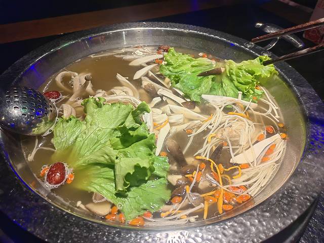 逛了一圈,说实话有点失望,找不到吃的。感觉像进了每个地方古镇的商业街一样。最后选了这家吃菌汤火锅。