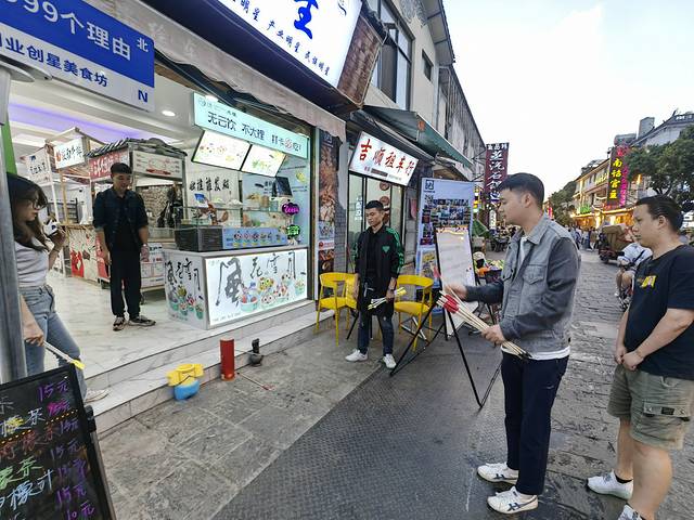 刚进来古镇的时候能看见很多推小摊的卖水果,不得不说水果不是很新鲜,买了一个榴莲简直就是坑。很多店都是石板烧,我们把车停好,行李放好。就开始逛古镇啦,我们到的时间大概是下午六点左右。