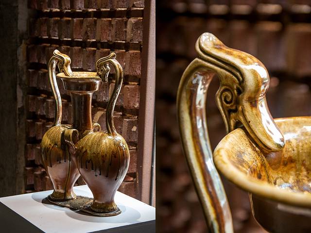作为中国传统文化里好兆头的课代表,鹤自然也不容缺席。一口由两只鹤叼着的鹤瓶也是丙丁柴窑里一件让人印象深刻的作品。或许所有的艺术作品都有一个共同的特点,经得起仔细打量的细节。虽然道不出其中的原委,但一两条线条,或流畅,或略带棱角,便勾勒出了一只栩栩如生的仙鹤。