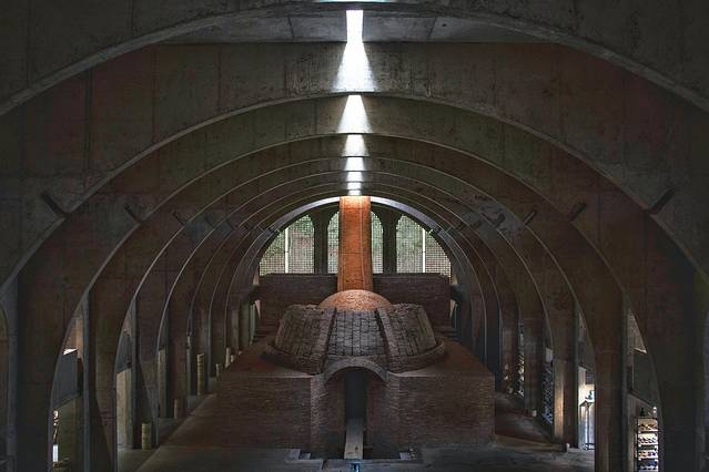进入馆内,也先从建筑本身逛起。建筑的内部是一个轴对称的结构,中轴线的天花板上很巧妙的开了一缝天窗,让阳光能够自然的挥洒进来,与之呼应的是地板的中轴线也铺了玻璃板和灯,形成了一种秩序的美感。
