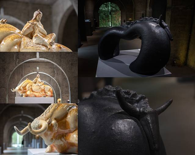 丙丁柴窑的过道的C位展览位上,摆着两只风格截然不同的牛牛。一只是背着个吹笛人,正俯身快步前行的偏向于玉石质感的牛,另一只则是现代极简风下用线条勾勒出的正昂首阔步前进的偏向于铁石质感的牛。两种不同风格的同主题作品,都透露着现代工匠对陶瓷技艺的思考,即使是对陶瓷艺术毫无认知的普通游客,也能感觉陶瓷技艺的精彩绝伦!