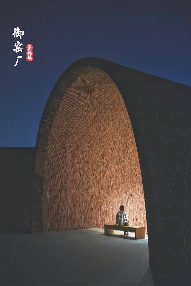 御窑厂很大很大,里面攘括了商业街和考古开发的现场,作为主体的御窑厂博物馆,本身便是一个出自大师之手的建筑作品。建筑表面看上去全部是由红砖组成,通过各种弧形的设计,以及湖面的镜面反射,在暖色灯光的衬托下,建筑本身成了一个拍照的圣地。建筑到处都是由光影和弧线构成的框架,这里的打卡照绝对是景德镇之旅的C位照片之一。