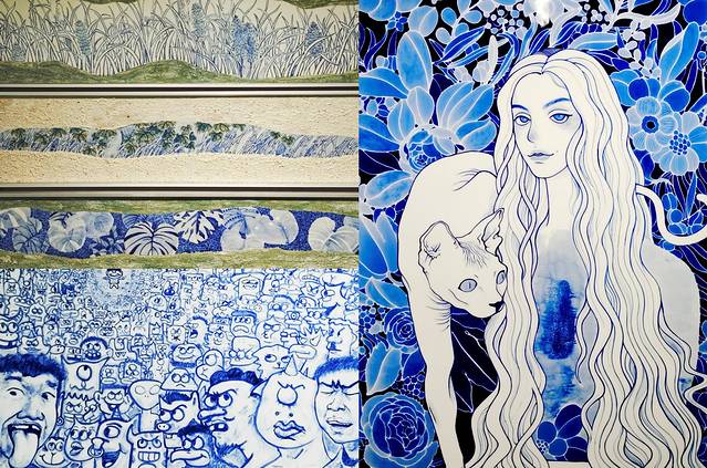 瓷板画。顾名思义,在瓷板上利用陶瓷的制备工艺画画,主要还是以氢化为主,不同矿物比例的青花构成了五彩斑斓的蓝色图画,加上釉上彩工艺的点缀以及陶瓷温润的质地,瓷板画带来了一种纸张所难以表达的美,