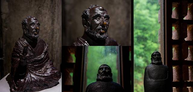 不同于传统僧像的慈悲或威严,这里的摆着一尊比着yeah的僧人。现代幽默的加持下,这尊僧人更加的平易近人,更有一种步入人间的亲切感。这还有一尊似乎不是那么中国僧人造型的僧人,似乎是中西方文化融合的产物,也是一件融入当下的作品。