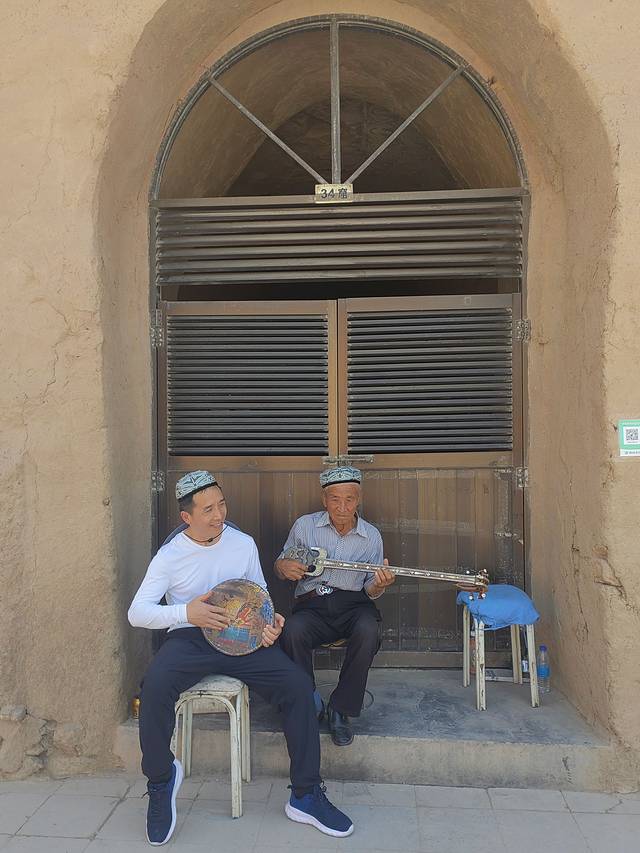 洞窟门口有残疾证的维吾尔大爷,拿着热瓦普在弹(百度查的)。我以为就是合影收费的那种,就刷了10元。结果,大爷给我戴了帽子,又塞给我一个手鼓,自己就开始认真的弹奏起来。我立马跟上节拍,配合的天衣无缝。拍照小姐姐都说我节奏打得很好。