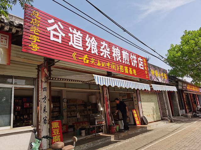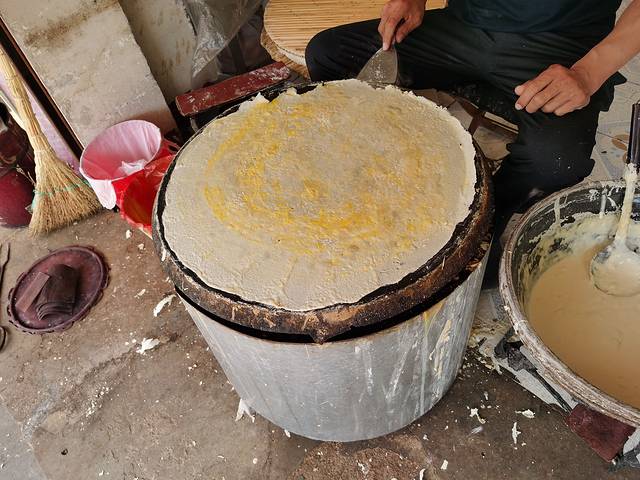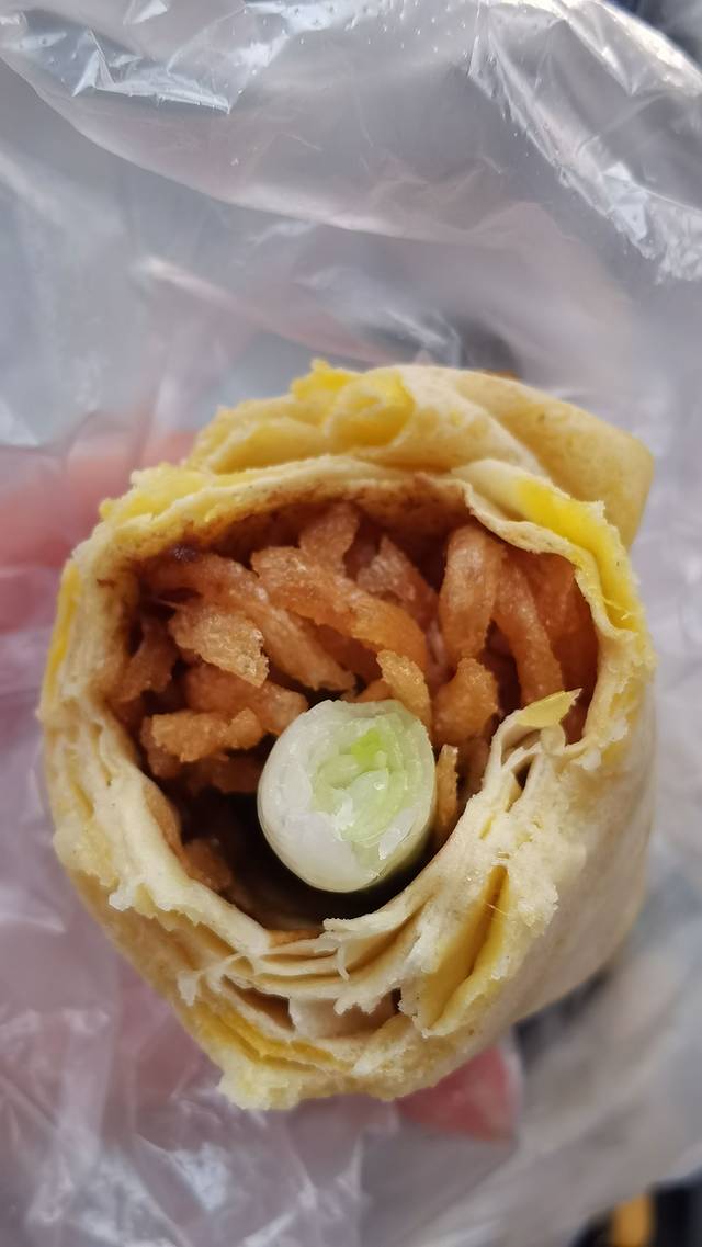 确认了他家就是之前拍舌尖上的 中国 的那家就让大哥赶紧给我做一个。煎饼现做,我说了要两个小时以后吃,就特意帮我烤的硬一些,里面先放上馓子,然后撒芝麻花生碎,之后放上大葱一圈,长长的一个,我吃的时候咬着还有微微的翠感。不建议加辣椒会遮住葱味儿。