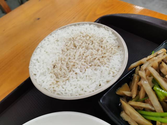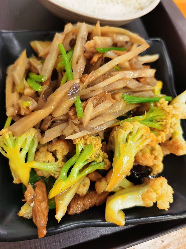 我来的时候已经1点多了,里面大概还有七八桌客人。他家是透明的橱窗,可以直接看到菜,左侧是炖菜,按个收费。右侧是炒菜,可以拼盘儿。我要了一块甏肉,一块儿海带,一块儿豆腐,然后拼了藕片儿和菜花儿,米饭让她稍微给加了一点点汤。