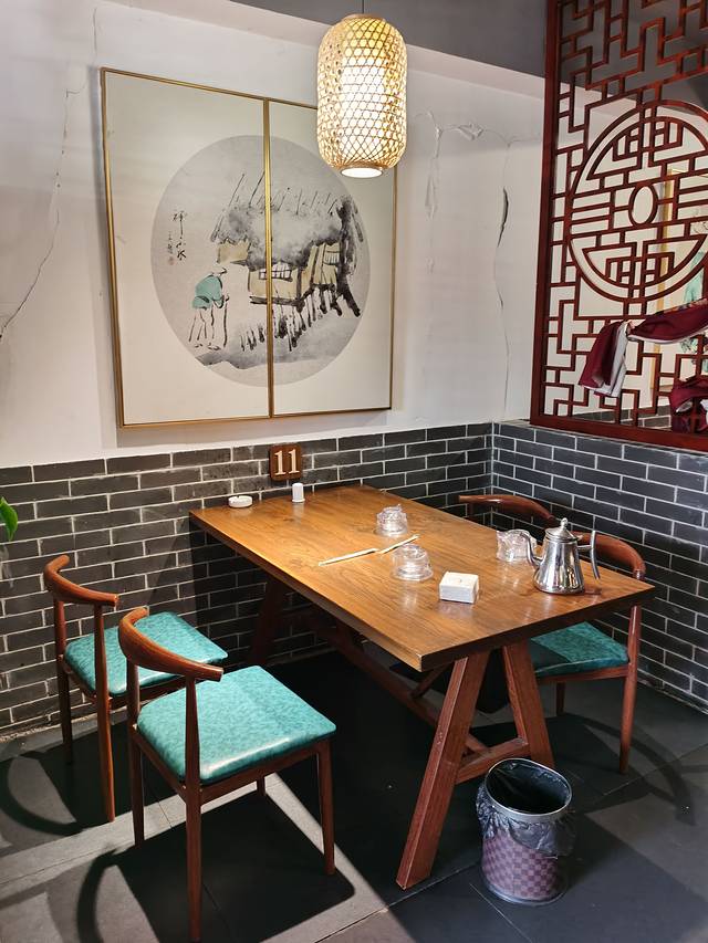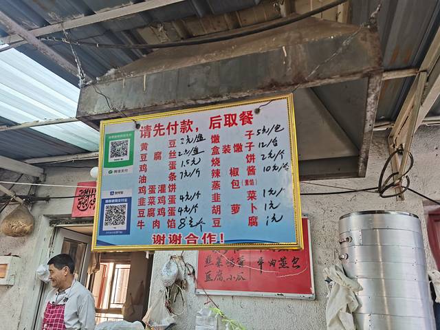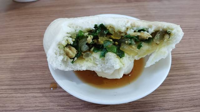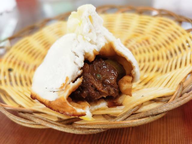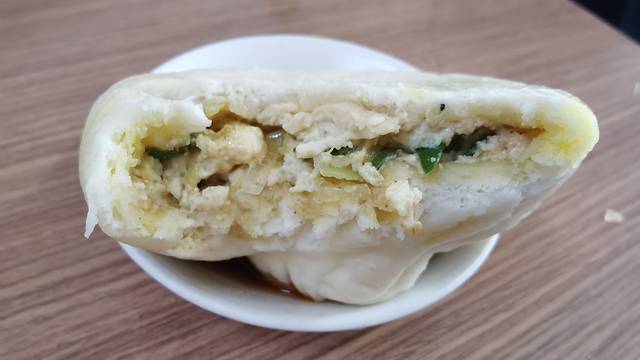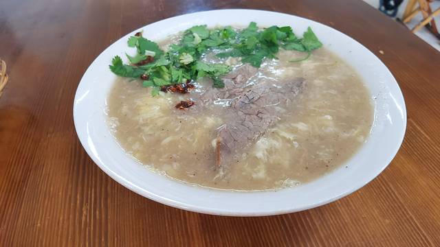 大众点评收录10年老店,人均14,位置有朋路6号,6点营业,距离约1.1km,步 行约18分钟。我一路溜溜达达,6点整到的,已经开门了。糁类似于米糊,不同价格就是牛肉的量不一样,为了多尝几种,我只点了8元的牛肉糁汤,然后一个牛肉包一个素包子,一共11元。糁汤很大一碗,五香粉味道比较浓郁,辣椒、醋、咸菜等在旁边自取,我喝着咸淡正合适。喝了几口就开始冒汗,大早上的很驱寒。包子都是煎包,馅料足,多年老店果然很不错。