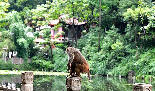 2、黔灵山(一定要去,门票只要五块钱,一路上还能看到许多的猕猴,猴子不要惹,东西装背包里,手里提袋子一定会引起注意并抢夺,有的猕猴还会自己打开矿泉水瓶盖喝水,也不害怕人。