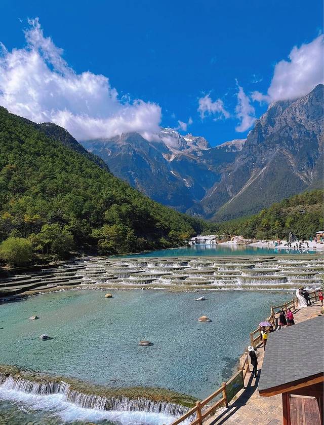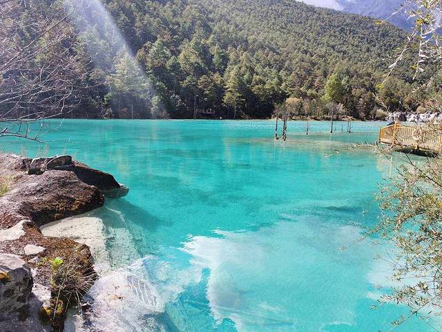 蓝月谷的水蓝的清澈,空气清新。源自雪山冰川的万古冰雪消融之后顺着峭壁流淌而下,最终在深谷之中形成了清澈见底、甘冽无比的河流,因河床由白色石灰岩构成,使整条河水呈现出白色光泽,分外纯净,晴天时,水的颜色是蓝色的,而且山谷呈月牙形,远看就像一轮蓝色的月亮镶嵌在玉龙雪山脚下,所以名叫蓝月谷。