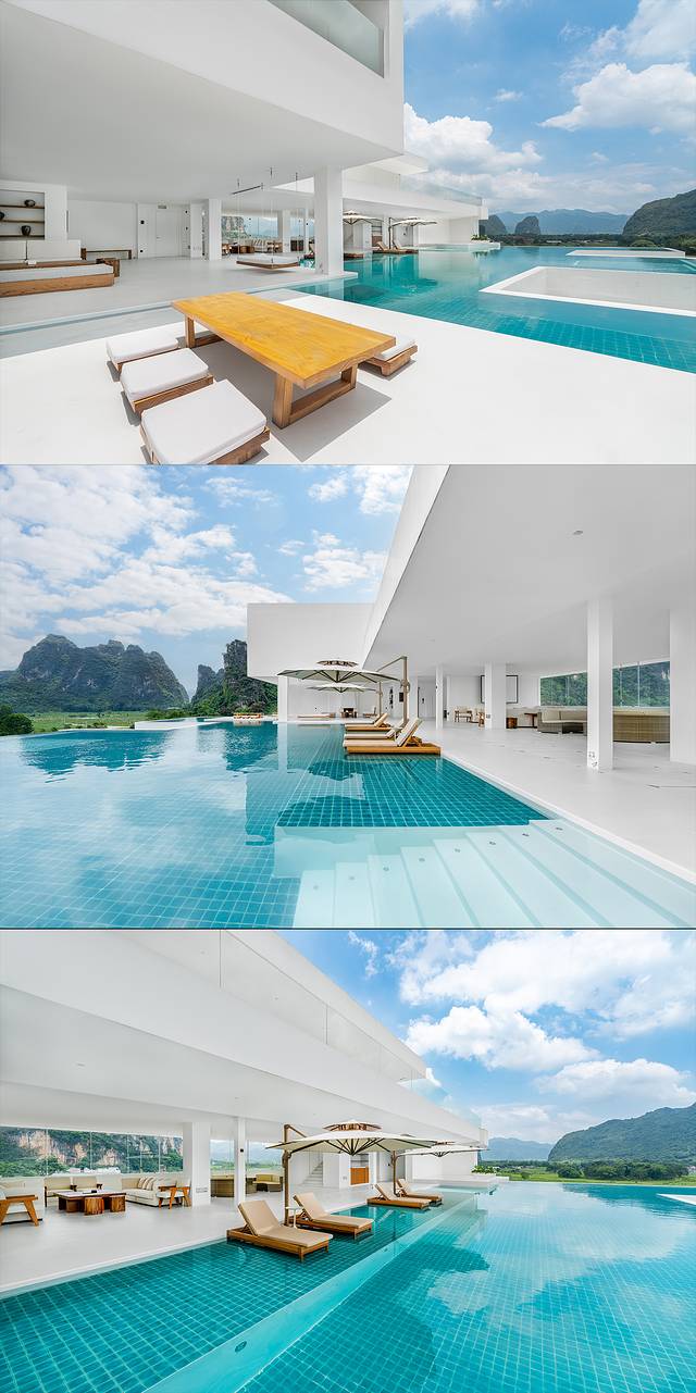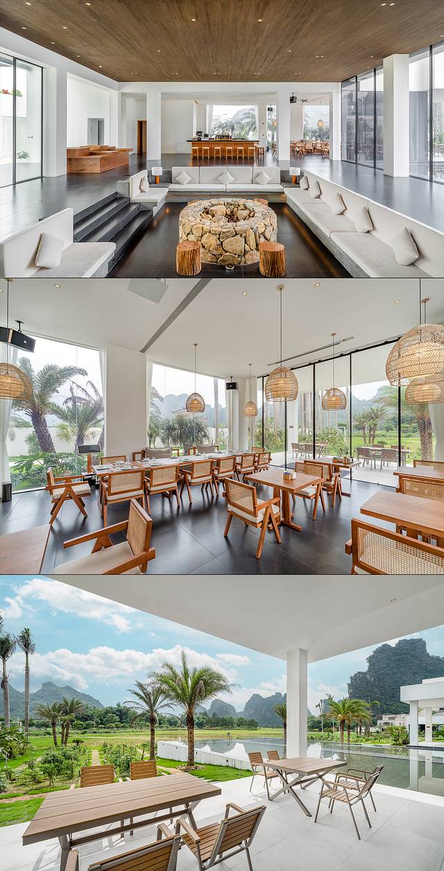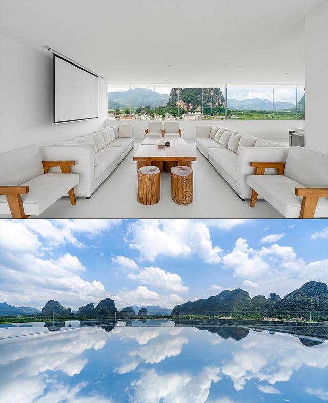 酒店纯白色的外观设计在峰林之中显得格外突出,内部设计运用了乡村元素与现代美学设计,不仅能带给宾客高端大气的感觉,还不失原有乡野的味道。