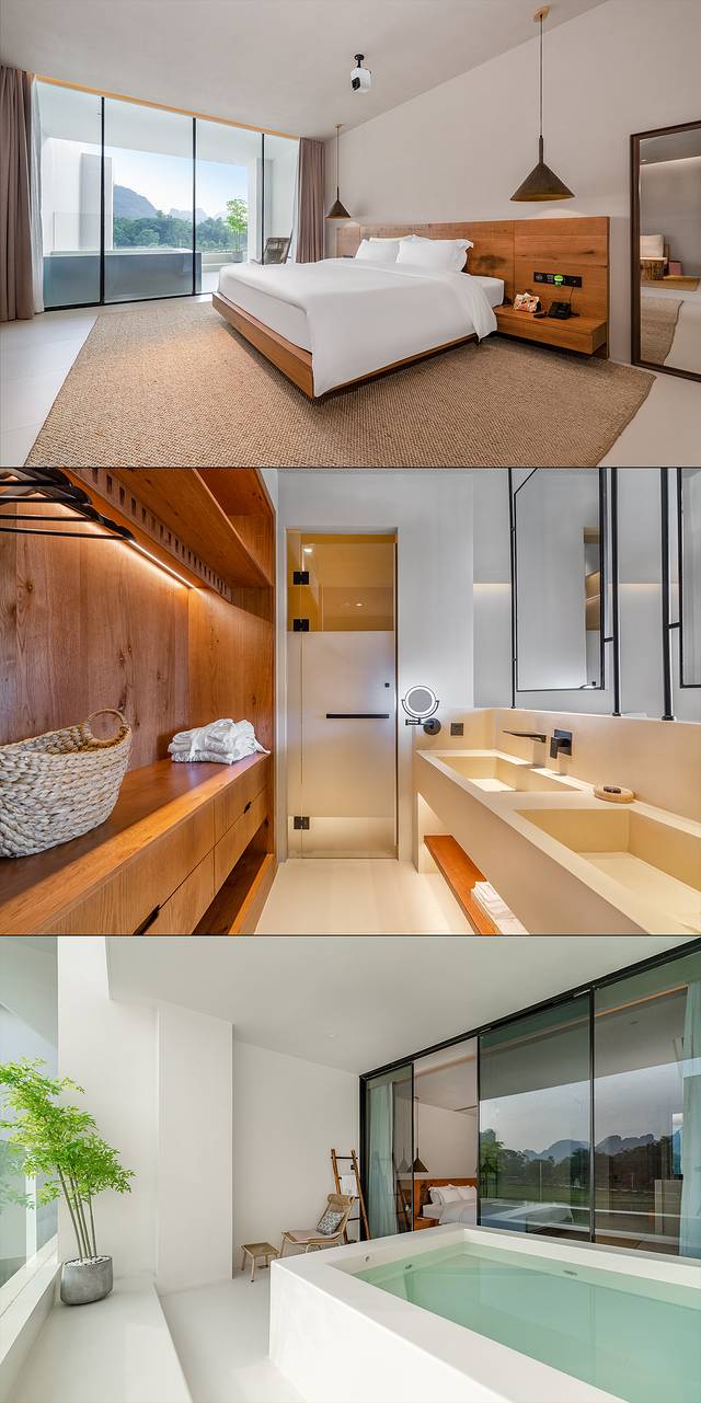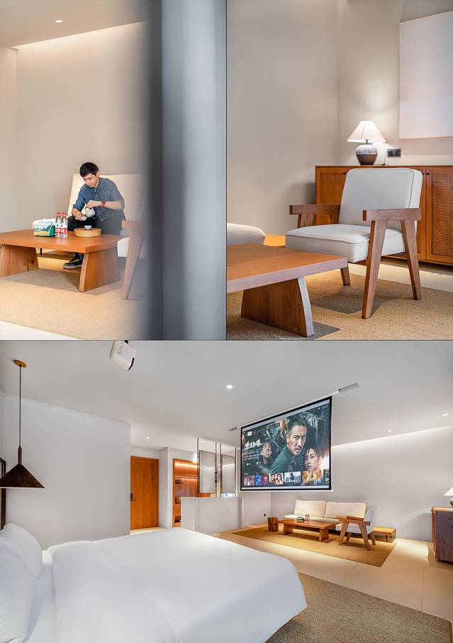 二、三层为客房,房间配置高端,空间宽敞明亮,简约低调的设计风格格外舒适。配有高清投影仪、智能马桶、戴森吹风机等,每间客房均设置了一个私人泡池🛀,夜晚泡澡看星空🌃,多么浪漫写意。房间内的迷你吧也是免费提供给宾客享用,非常贴心。
