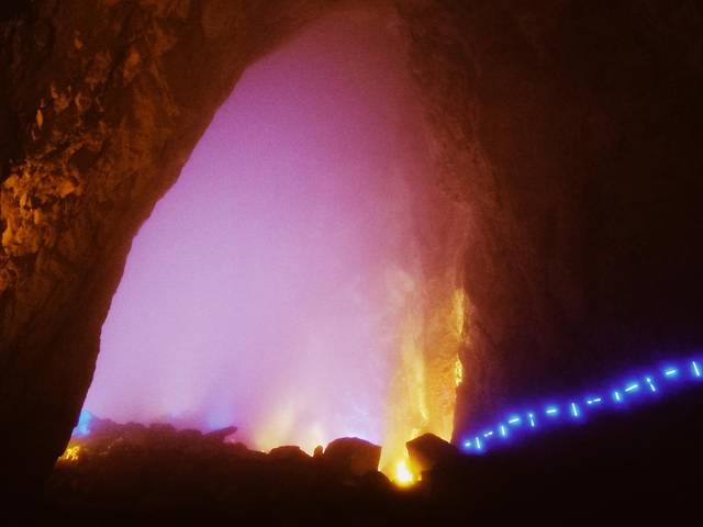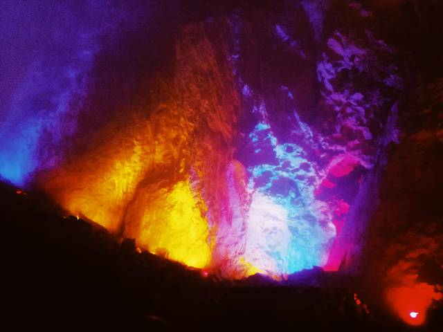 颜色是人类用灯光渲染出来的,但是形状确实大自然给与的,大概因为是水冲出来的洞穴,因此洞中常年都在滴水。雾蒙蒙的洞穴配上五光十色,使人不知不觉就醉了。
