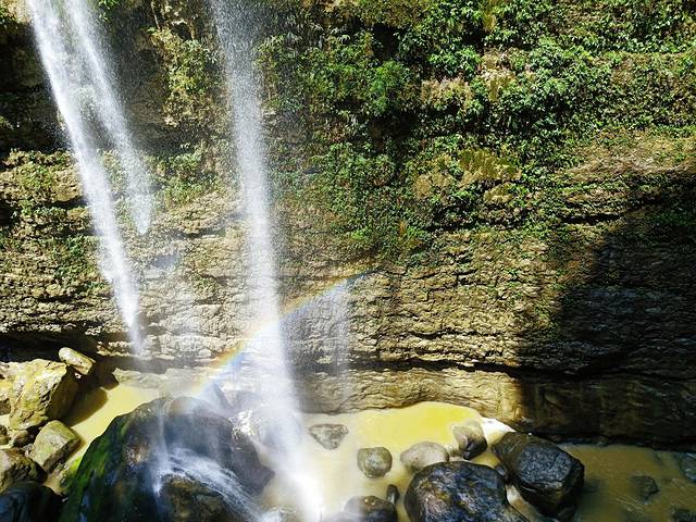 地缝上共有7条半瀑布,其中彩虹瀑布是地缝中众多瀑布中第一个被阳光照射到的,每当阳光照射,通常就伴有两道或三道彩虹出现,给瀑布增添了几分神秘色彩。