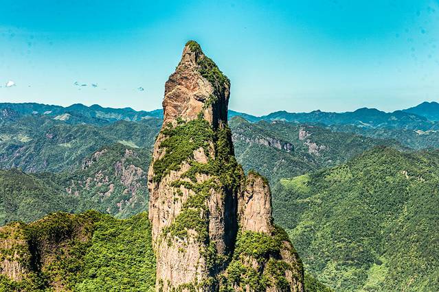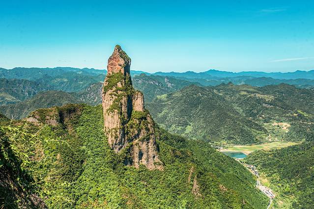 下了扶梯,还在惊叹面前开阔的山野,一转身,忽然发现,神仙居最具标志性的景观观音峰居然就在身边!这里也是李白诗里“霓为衣兮风为马,云之君兮纷纷而来下。虎鼓瑟兮鸾回车,仙之人兮列如麻。”的仙人代表。