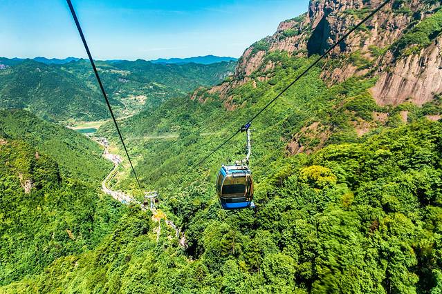 过了检票口,不远就是索道。乘坐缆车上行,沿途仰望山岩,风景也颇为震撼~