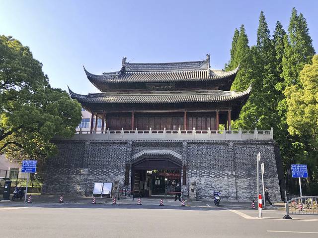 出了方塔园右手就是松江博物馆,可惜4:00多不让进了。再向南不远就是云间第一楼。大凡至今留存下来的古建筑都有着惨痛的历史,这个楼也是在元代就遭火灾重建,明末,又毁于兵灾,清顺治年初又重建,在旧基上,重建鼓楼三楹,以司更漏。楼共建二层,立于砖木结构的门道上,周围清水砖墙,翘角飞逸,古色古香。30年代初,县长金庆章募款重修此楼,立横额“云间第一楼”,又竖《重修云间第一楼记》石。旧时松江城内房屋低矮,而鼓楼高达16米,松江古称“云间”,如此就有了今天这个好听的名字“云间第一楼”。