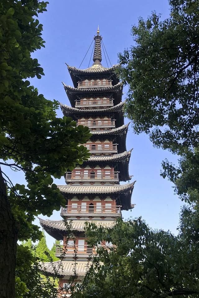走进园中透过树叶远远看到方塔-兴圣教寺塔,这是一座砖木结构的佛塔 ,砖砌塔身,方木结构,平面呈正方形,所以也叫方塔。