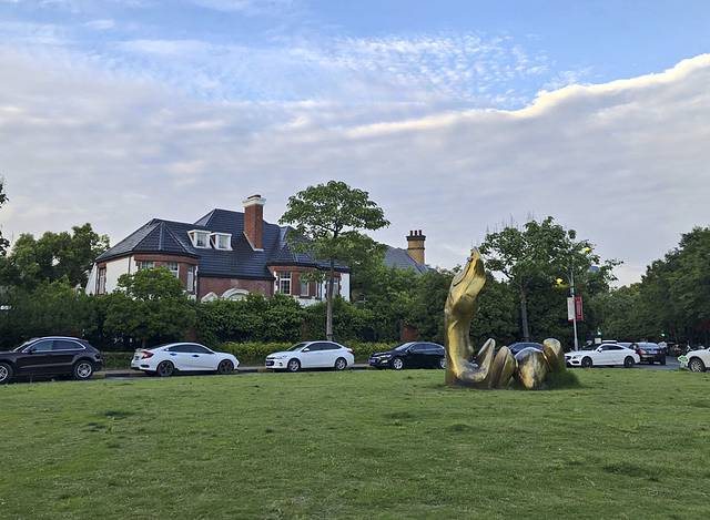 前两个园林我虽然也是清晨到访,但天气阴,景色不够明朗,而今天蓝天下的醉白池清丽艳美,让人心情大爽。进门向右再向右,穿过一片绿地花园,首先找到了“十鹿九回头”石刻,寓意离别家乡外出经商打工之人怀念故土,希望叶落归根。