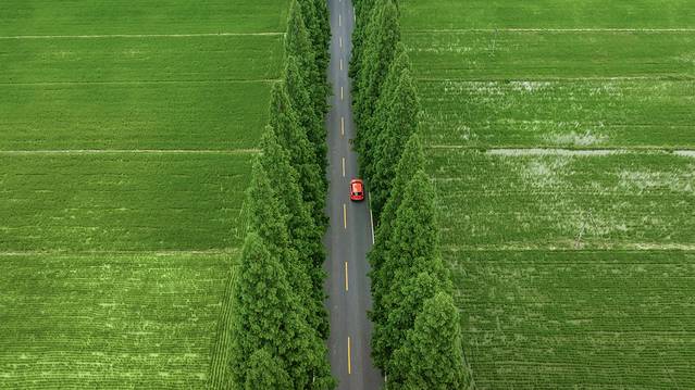 武王线从 武义 高铁北站站前大道到王大陆村,全长2.05公里,树的两旁都种植着高大通直的水杉,一年四季,都有不同的景致。初夏时节,新绿萌生,行驶在最美公路上,满眼的翠绿,放眼望去,两侧的茶田也是一派绿意盎然,连心情也跟着明快起来。