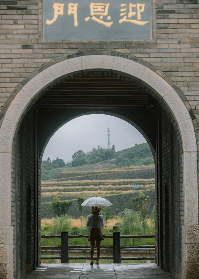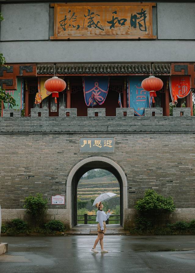 古镇以迎恩门为界,穿过迎恩门,就是一派自然田园风光了,虽然下着雨,却别有一番烟雨朦胧的美。