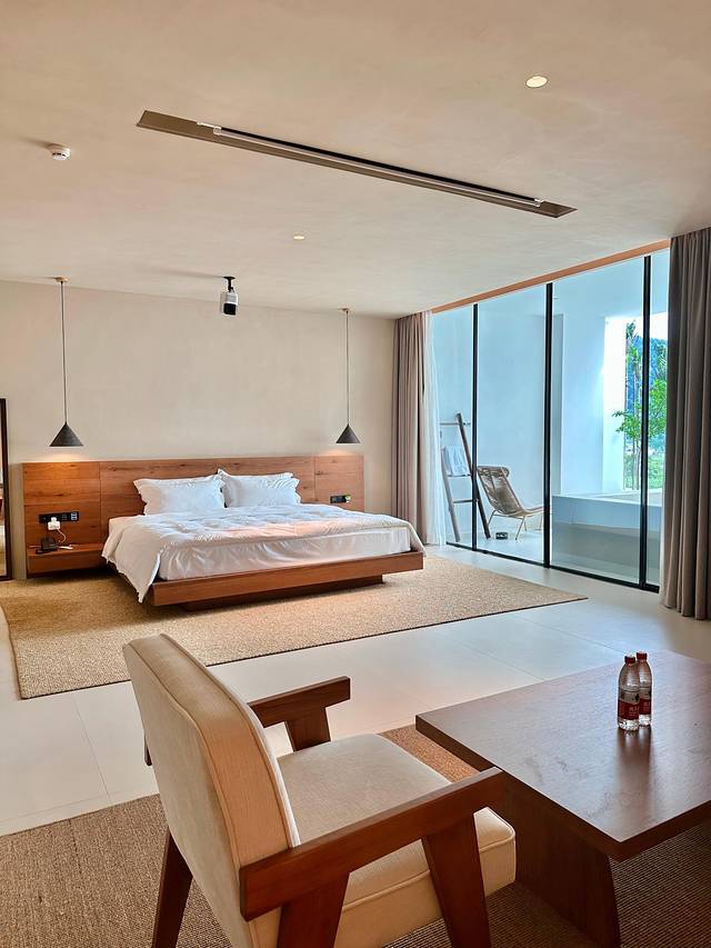 我入住的房间在主楼,空间超级大,侘寂极简风格非常耐看,冰箱里饮料和茶具茶包都是免费使用的。电动马桶、电动窗帘、投影仪等让体验感升级。