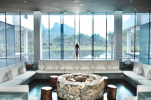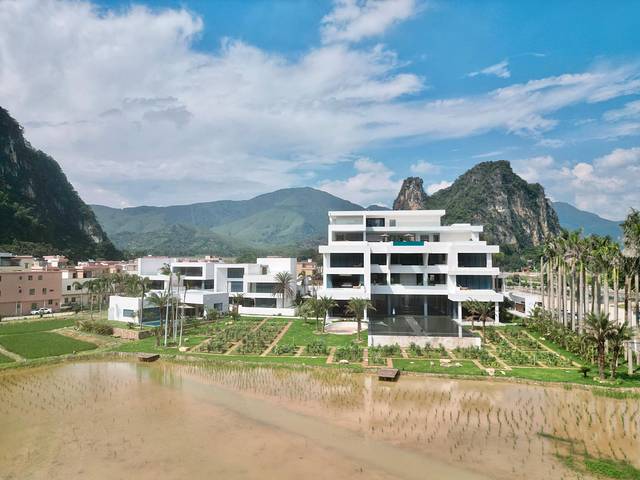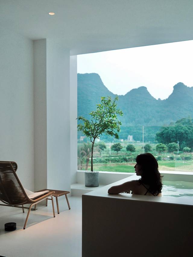 绿油油的禾田将其包围,而这也是属于酒店的一部分,它处在英西峰林核心地段,满屏都是山水田园和绿植,360度呈现水墨画实景,城市人要找的逃离喧嚣之地就在这里。