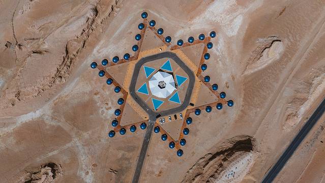 3、途中的另一个地点“孤独星际酒店”也非常值得一去,这里除了酒店还有餐饮,里面的“食神餐厅”味道和菜色出品相当不错,在这样的茫茫戈壁上能做出这样的品质实属难得,而且性价比很高。只是如果想入住酒店,这里常年爆满,需要提前很久预定。但是住不上酒店也值得途经打卡,从天空俯瞰像是一个坐落在茫茫戈壁上的六角星。