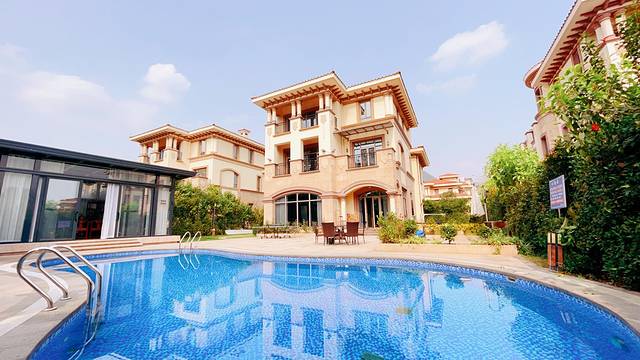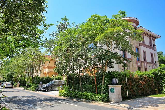 每栋别墅都设有电梯,其中有多种房型可以选择,还有客厅、厨房、茶室、私家花园和温泉泡池等,设施非常齐全。最让人喜欢的是户外泳池,映衬在蓝天下的池水碧蓝,畅游其中,不失为一道靓丽的风景。